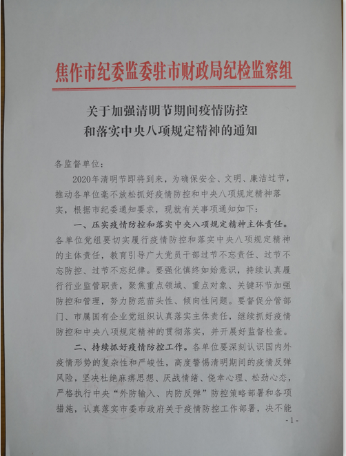 焦作市紀委監(jiān)委駐市財政局紀檢監(jiān)察組關(guān)于加強清明節(jié)期間疫情防控和落實中央八項規(guī)定精神的通知
