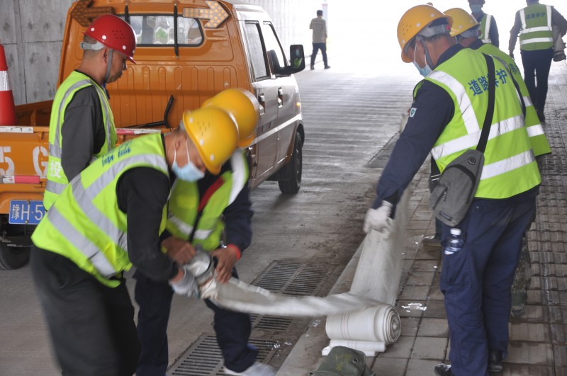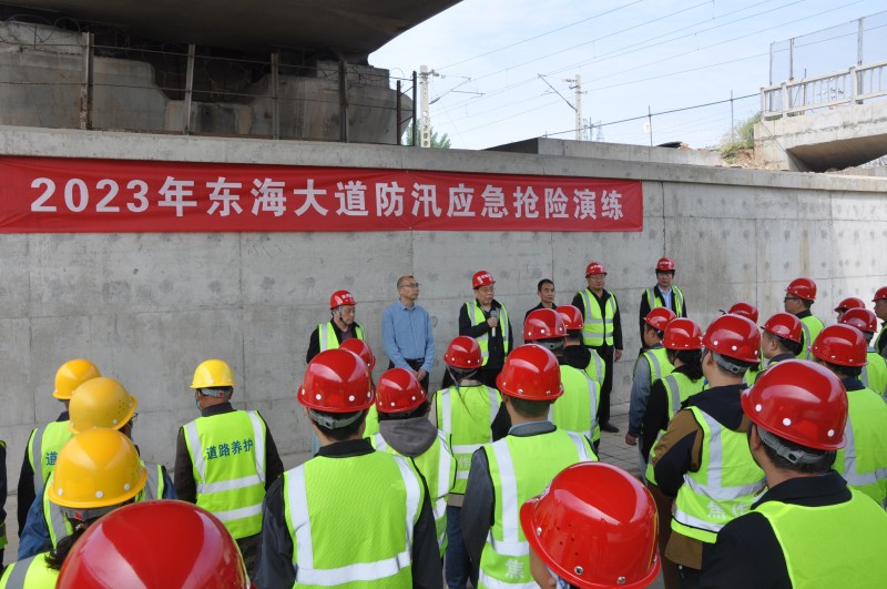 演練地點選擇在2021年汛期受災(zāi)嚴重且具有典型代表的東海大道U型槽段。演練以模擬我市大部分地區(qū)出現(xiàn)強降水過程,省、市氣象部門發(fā)布暴雨紅色預(yù)警信號,市防汛指揮部通知啟動一級應(yīng)急響應(yīng)行動,東海大道U型槽段機動車道積水最深處達到30cm,車輛無法通行為背景。集團公司防汛指揮部接到險情信息后,迅速啟動應(yīng)急預(yù)案,在U型槽路面最低處慢車道兩處雨水檢查井設(shè)置抽水泵,同時布置水帶繞過U型槽東側(cè)外墻至高位雨水檢查井,通過高位雨水管道將積水排放至山門河。